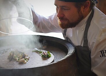 6 Top-Chefs der Jeunes Restaurateurs bringen 6 coole Gänge auf die Teller. 6 Michelin-Sterne und 24 Hauben werfen die Chefs in die Waagschale! Mit dabei sind Lokalmatador und Mitgastgeber Thomas Dorfer (Landhaus Bacher **, 5 Hauben), Andreas Döllerer aus Golling in Salzburg (Döllerers Genusswelten **, 5 Hauben), Dominik Utassy von der Geigeralm im steirischen Altaussee (*, 4 Hauben), Hans-Jörg Unterrainer & Stefan Birnbacher vom Kirchenwirt in Leogang in Salzburg (*, 4 Hauben), die Unterwirtinnen Katrin & Sabrina Steindl vom Unterwirt in Ebbs in Tirol (3 Hauben) und Michael Kolm aus dem Waldviertel (3 Hauben).