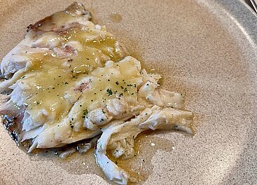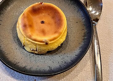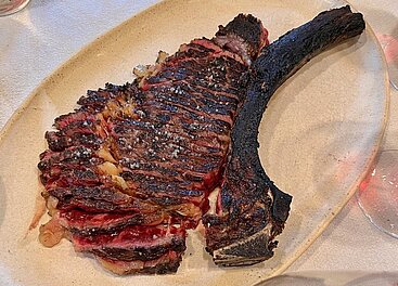 Hier geht es dann zur Sache. Sekundenkurz angebratener Thunfischbauch, ein stundenlang geköcheltes Ei, purer Kaviar auf weißem Schaum, rote Wildfanggarnelen (Carabinieros), Herzmuscheln im Sud, das Nationalgericht Hechtgoder (Kokotxas), Babycalmar an eigener Tinte, ein unvergesslicher Steinbutt in federleichter Butter-Zitrussauce, dann der legendäre Beef Chop am (verkohlten) Knochen – außen mit tiefen Grillspuren, innen butterzart zwischen medium-rare und rare, absolute Weltklasse; dazu die feinwürzigen Raucharomen. Zum Abschluss Goxúa (sprich: Goschua), die Crema Basque; baskisches Pendant zur Crema Catalana.