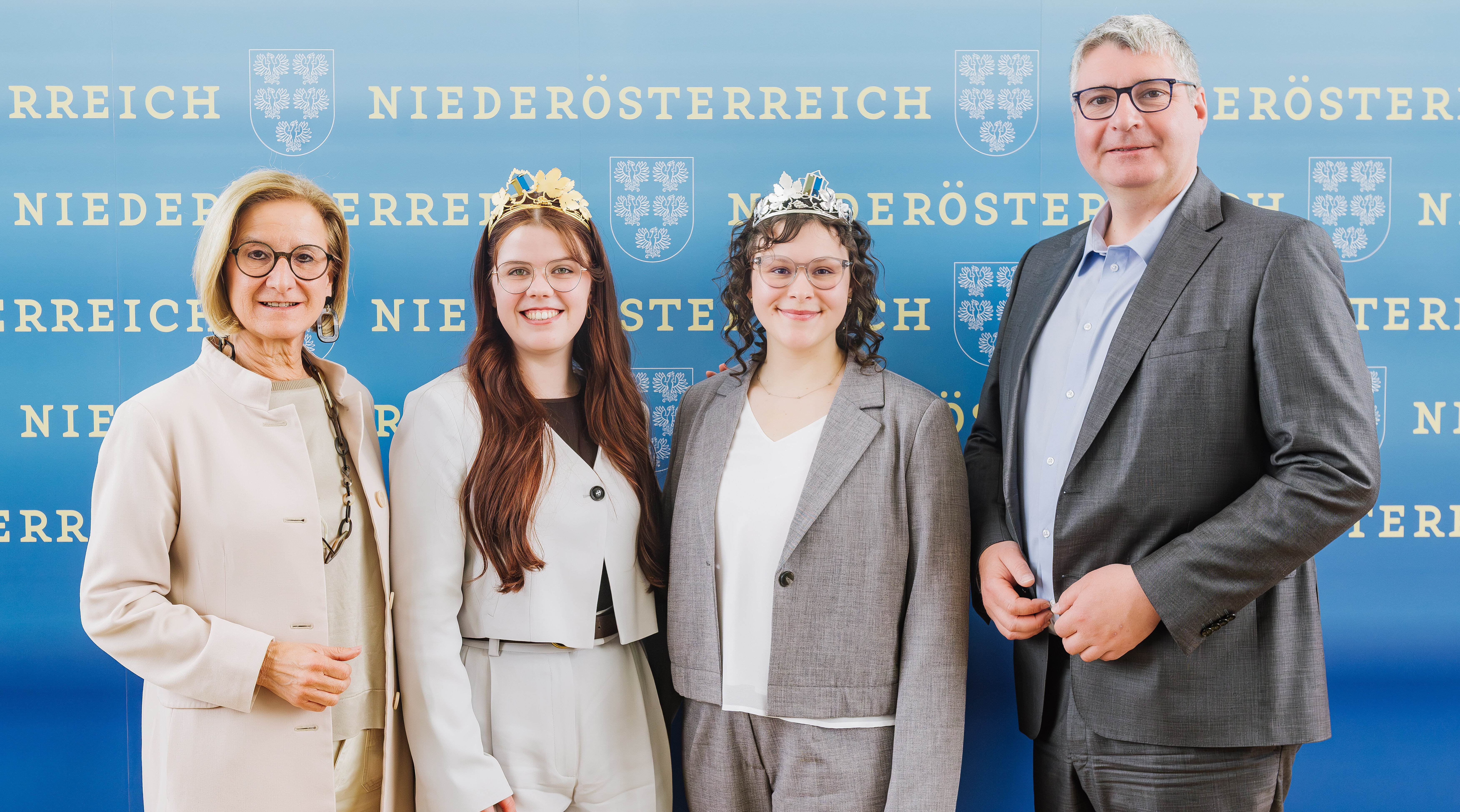 Erste Gratulanten der neuen Weinhoheiten (v.l.): Landeshauptfrau Johanna Mikl-Leitner, Weinkönigin Marie Huber, Vizekönigin Laura Neustifter, Reinhard Zöchmann (Präsident NÖ Weinbauverband). © LWmedia, Leonardo Ramirez