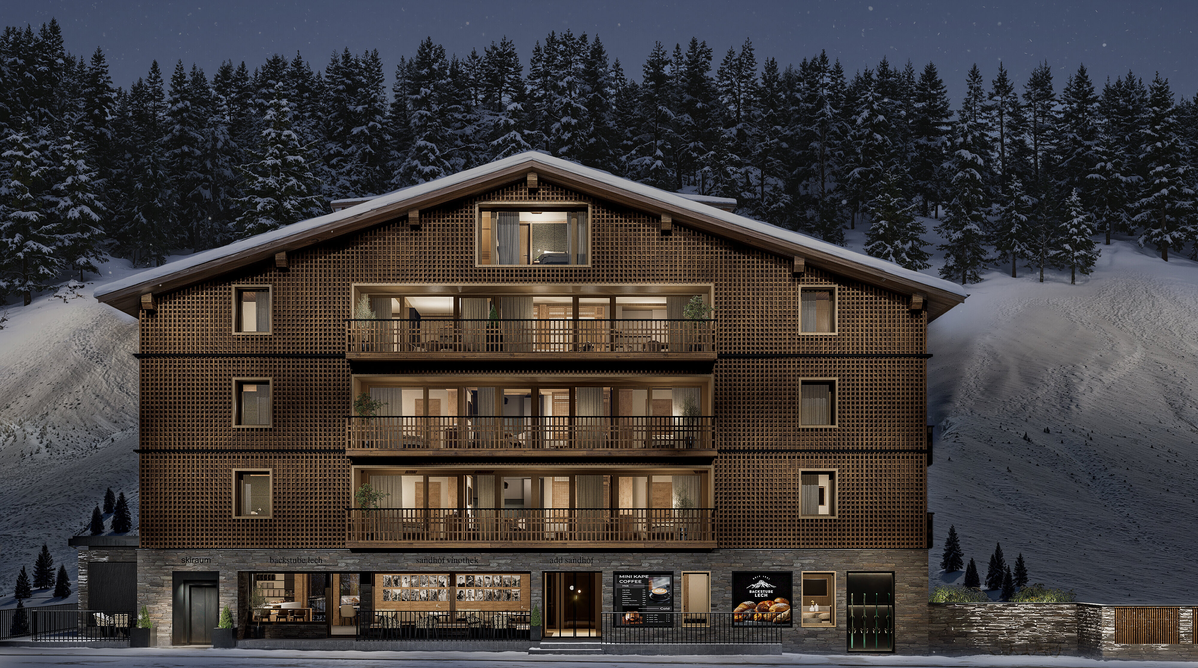 Im neuen Sandhof-Gebäude befinden sich 11 Apartments sowie eine Gastronomiefläche, die sich Weinbar und die Backstube Lech teilen. © Kitzmüller Architektur