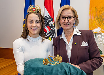 Niederösterreichs und Österreichs Weinkönigin Laura Hummel mit Landeshauptfrau Johanna Mikl-Leitner und der neuen Krone. © NLK, Burchhart
