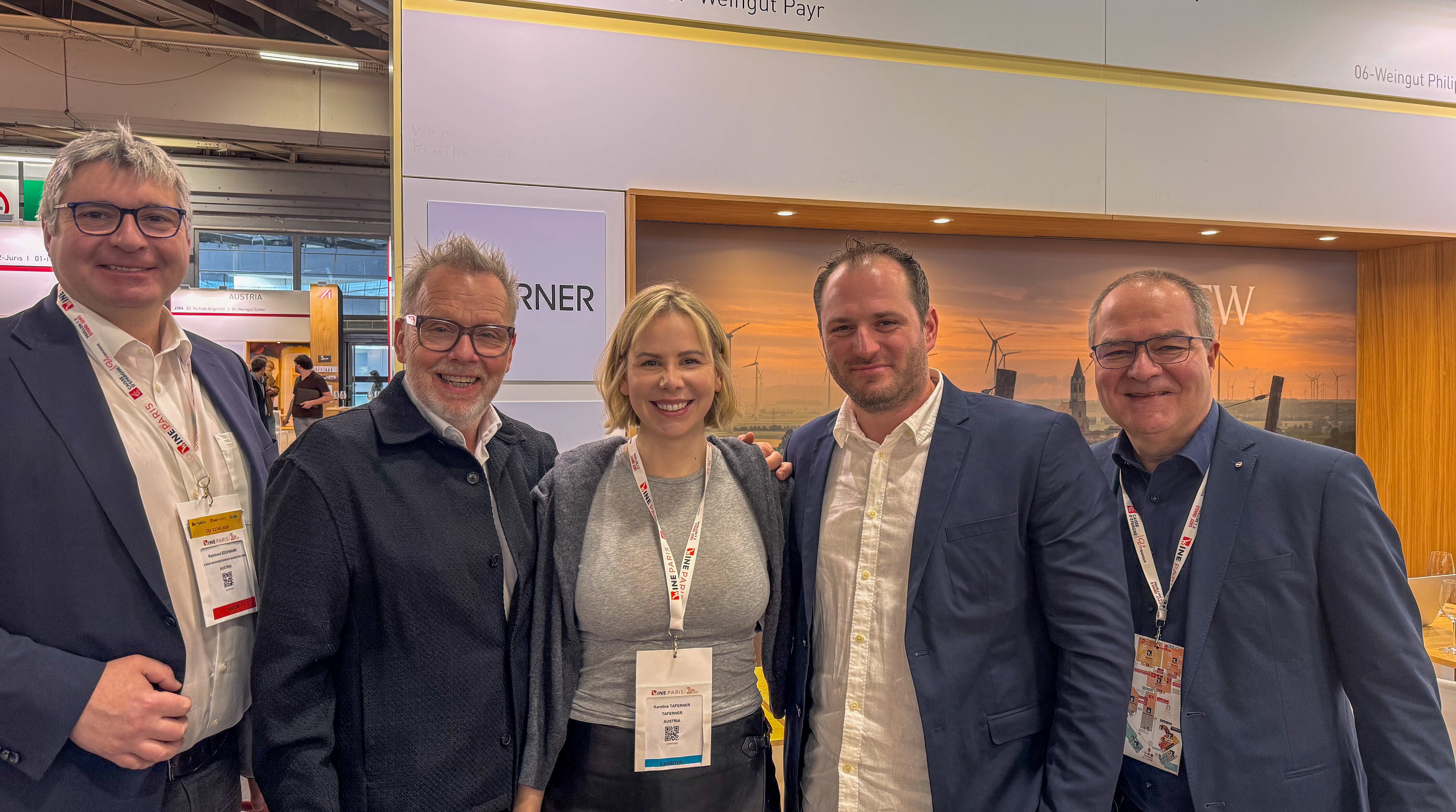 Niederösterreich stellte das mit Abstand größte Austria-Kontigent auf Europas größter Weinmesse, Wine Paris (v.l.): NÖ Weinbaupräsident Reinhard Zöchmann, die Carnuntum-Winzer Robert Payr, Karoline Taferner und Chrsitoph Artner sowie Wein Niederösterreich-Geschäftsführer Klaus Goldmann. © WeinNoe, Sophie Moser