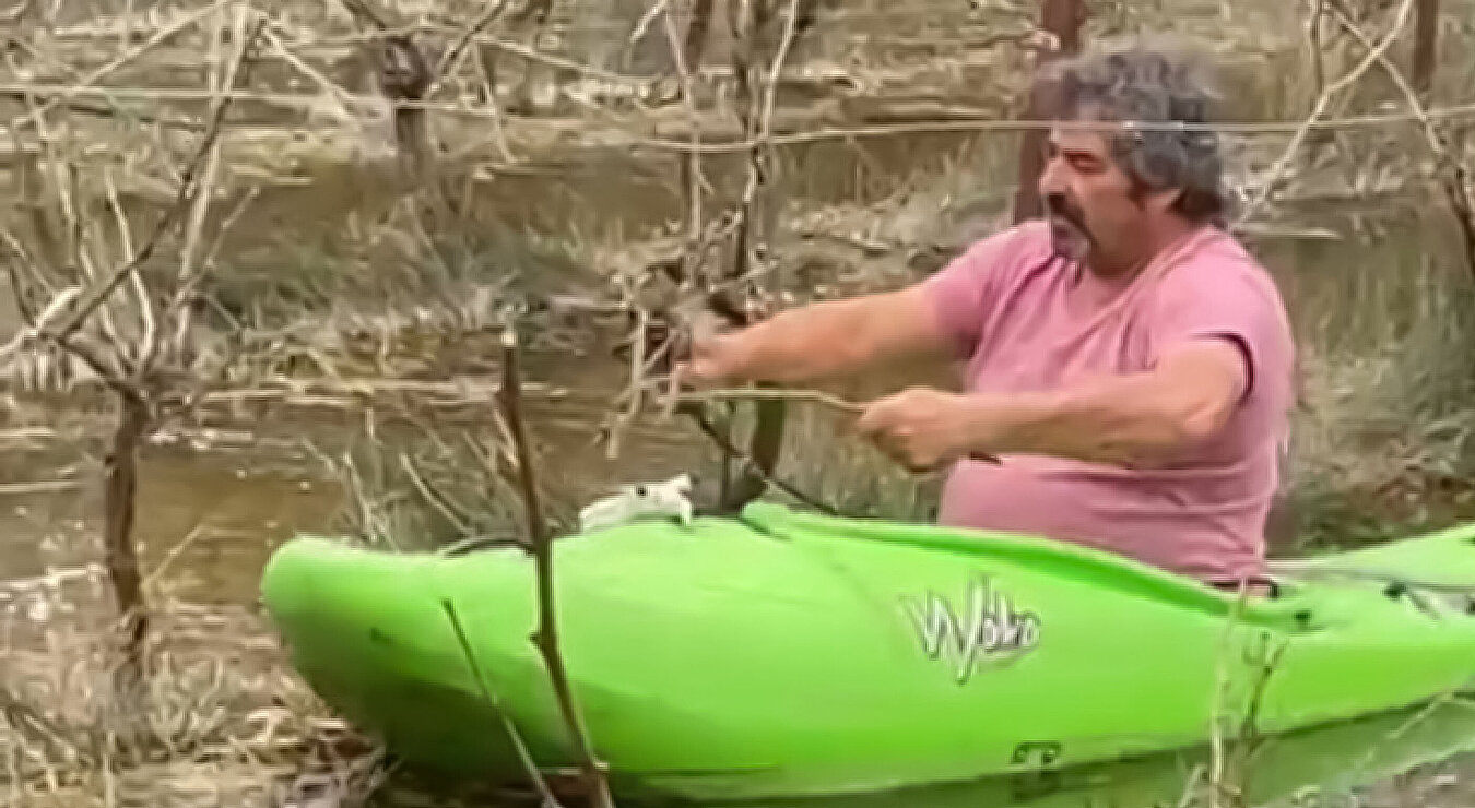 80 Zentimeter Wasser zwischen den Reben: Winzer arbeitet im Kajak