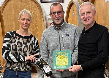 Vinarias Gratulationsbesuch bei Alan Manley (Mitte): Claudia Altrichter und Verleger Erwin Goldfuss. © Vinaria