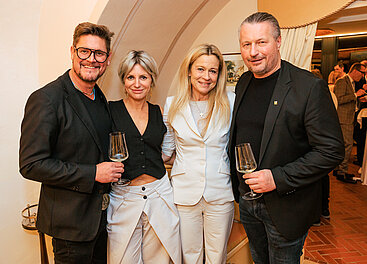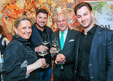 NÖ Landesrätin Susanne Rosenkranz, Spitzenwinzer Franz-Josef Gritsch, Nationalratspräsident Walter Rosenkranz, Jungwinzer Friedrich Lehensteiner (v.l.). © LWmedia, Leadersnet_A. Felten