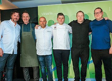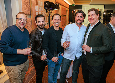 Gipfeltreffen (v.l.): 3-Hauben-Chef Michael Kolm, Topwinzer Johann Gisperg und Lorenz Haas-Allram, 2-Sterne-Chef Thomas Dorfer, Ginmaker Marco Weitzenböck (Wildstück). © LWmedia, Leadersnet_A. Felten
