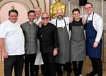 Gemeinsam mit Starcaterer Wolfgang Puck (Mitte) an der Oscar Front: die beiden Österreicher Bernhard Zimmerl (2.v.r.) und Mike Köberl (3.v.r.). © Bernhard Zimmerl