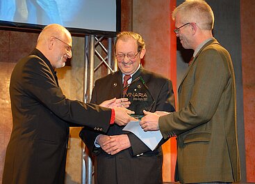 Auszeichnung mit der selten vergebenen Vinaria Trophy für das Lebenswerk im Jahr 2007 (v.l.): Vinaria Autor Viktor Siegl (†), Preisträger Anton Kollwentz, Vinaria Chefredakteur Peter Schleimer © Martina Lex