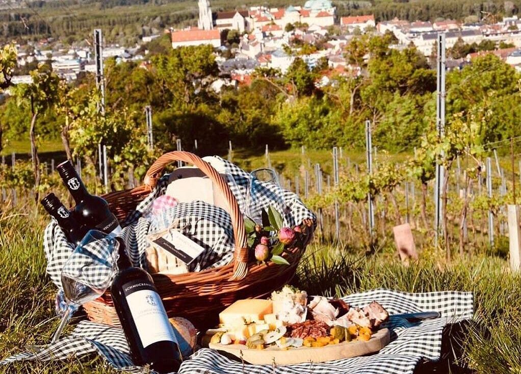 Einmalig schönes Picknick mitten in den Weinbergen und dennoch in der Stadt: Möglich ist das in Klosterneuburg, wo die Winzerfamilie Schmuckenschlager nicht nur feine Weine macht, sondern ebensolche Picknickkörbe schnürt.